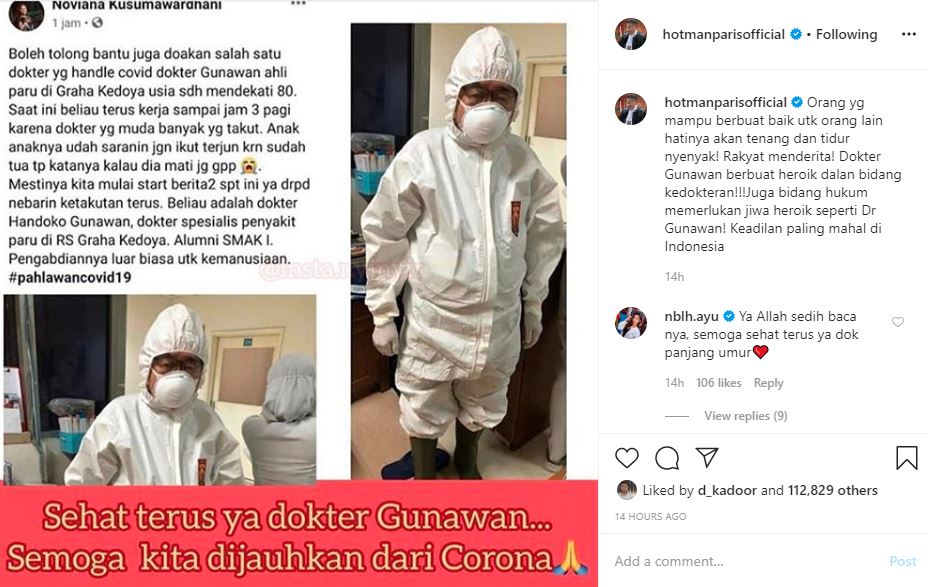 Pengacara kondang Hotman Paris Hutapea juga ikut mengunggah kisah dr Handoko Gunawan ini.